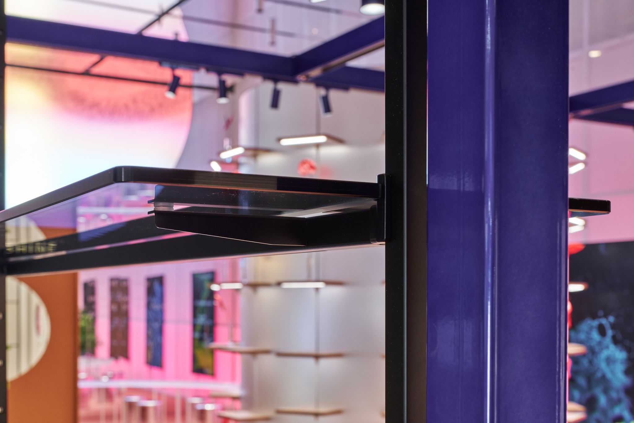 Light shapes spatial perception, while modular structures provide orientation. Wall solutions such as Xero 4 EVO and Beam EVO stage products with precision on glass and curved surfaces without compromising architectural clarity. With Spatio as a freestanding structural system, a flexible infrastructure emerges that integrates lighting, merchandise supports and digital elements, enabling a wide range of use scenarios.