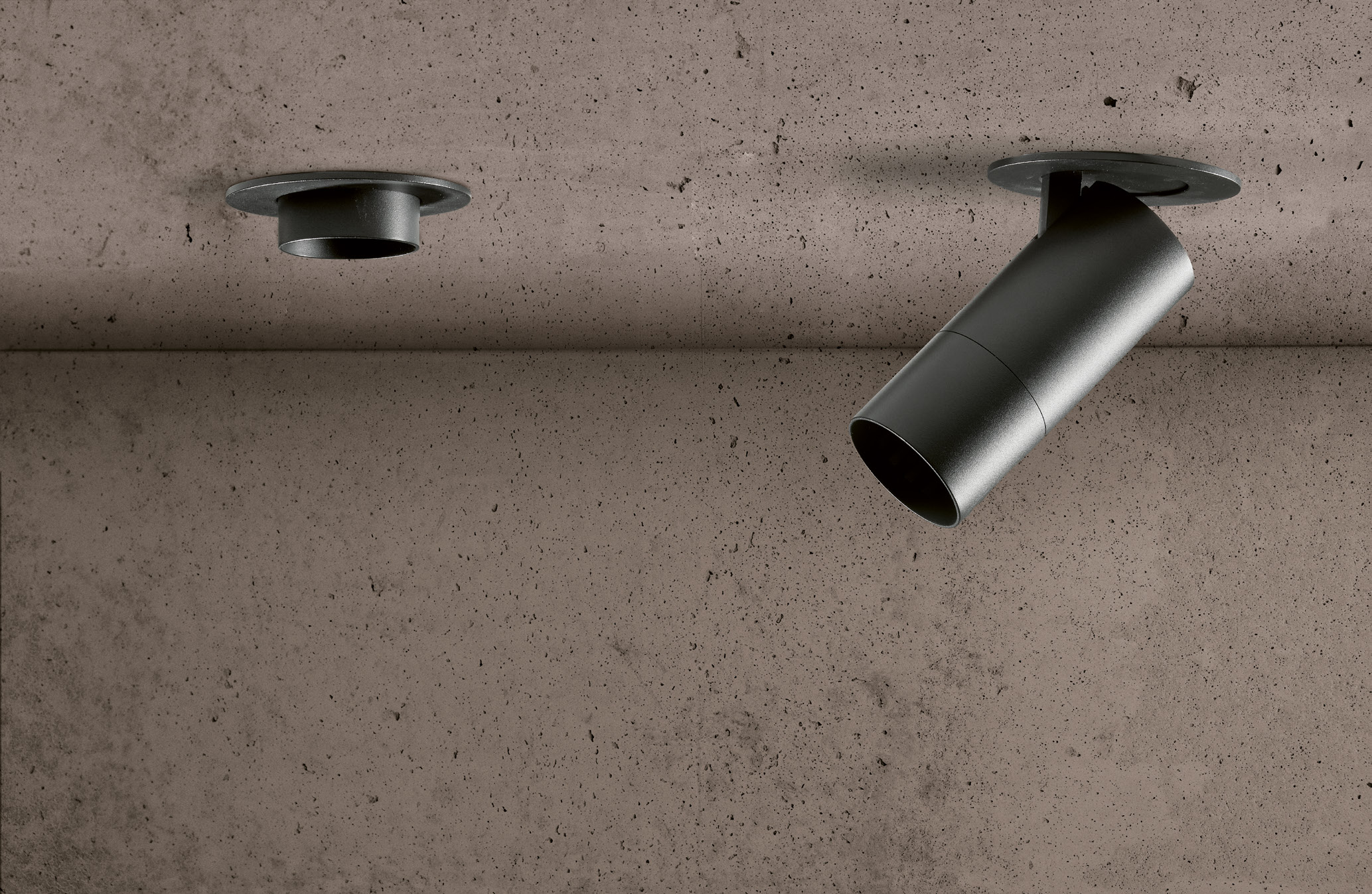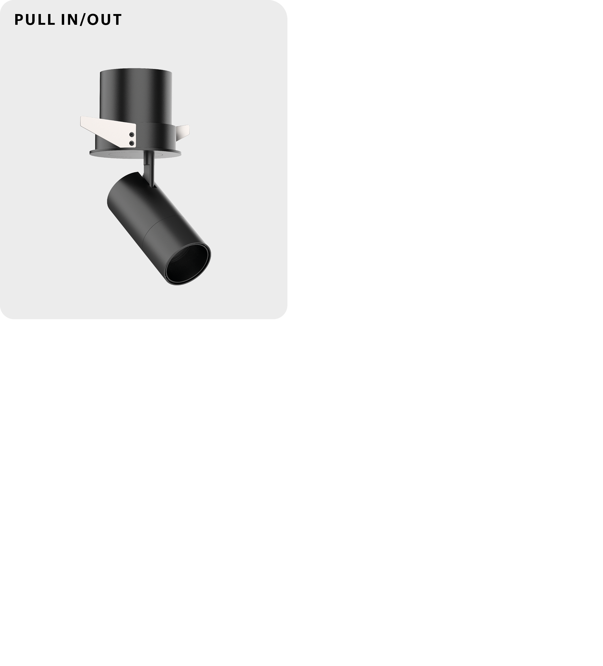 Recessed pull-in / pull-out mechanism that hides the spotlight inside a ceiling cylinder.