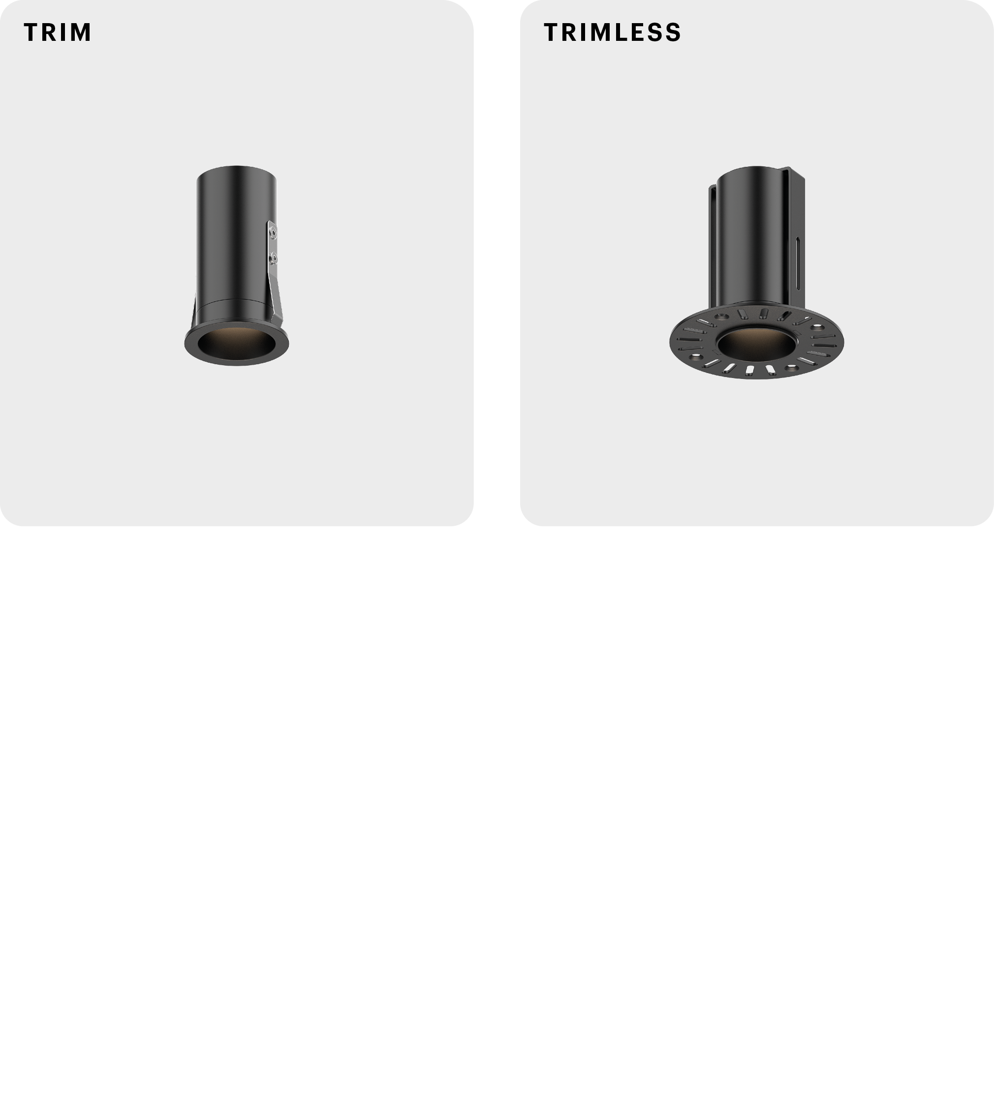 Perla trim and trimless are recessed spotlights designed to keep the ceiling visually clean and continuous. Trim features a subtle bezel, while trimless integrates flush into plasterboard for a seamless architectural finish.