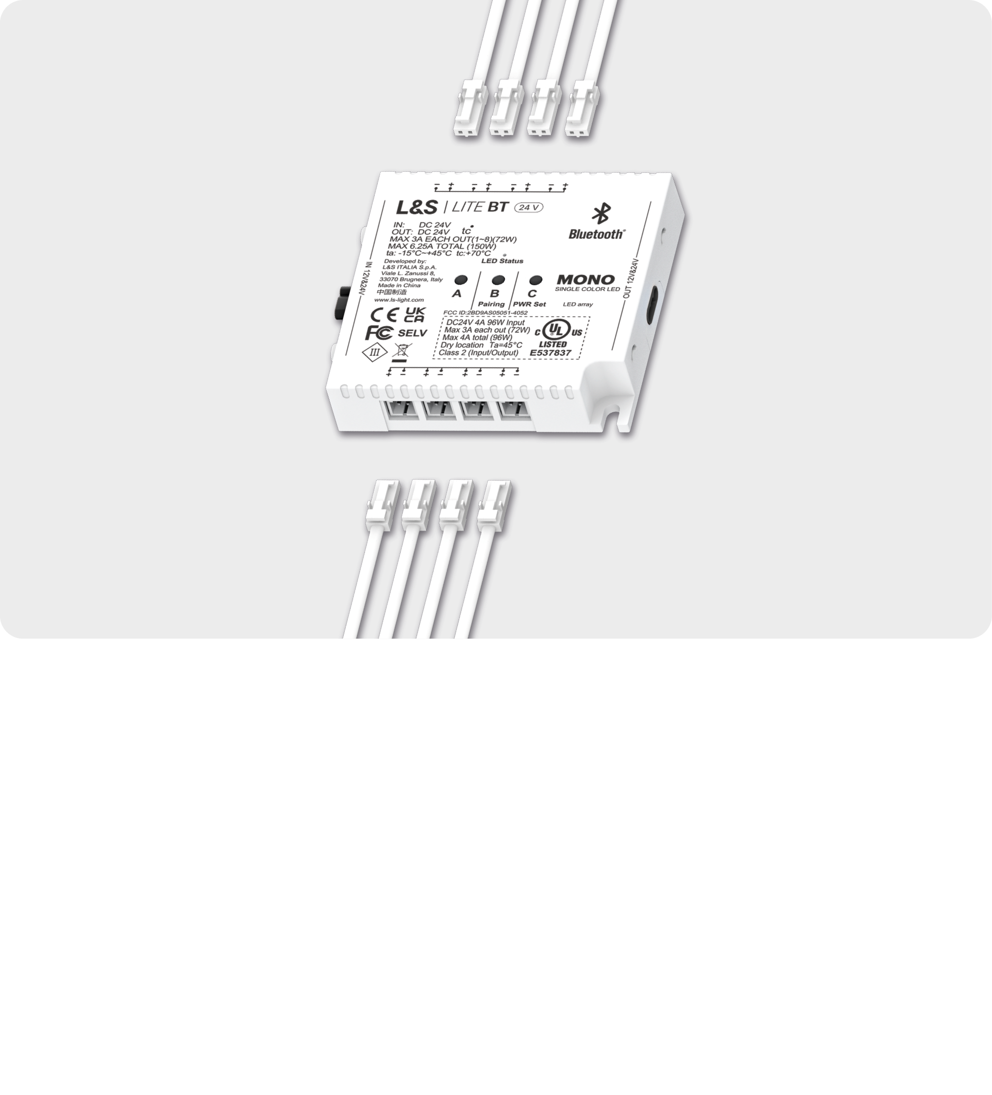 Simultaneous control up to 8 LED lights using compatible radio frequency transmitters or via Bluetooth with a smartphone. Available for MONO or Dual Color (EDC/WDC) LED. Maintain the same operating voltage of 24V for all connected modules in a continuous line.