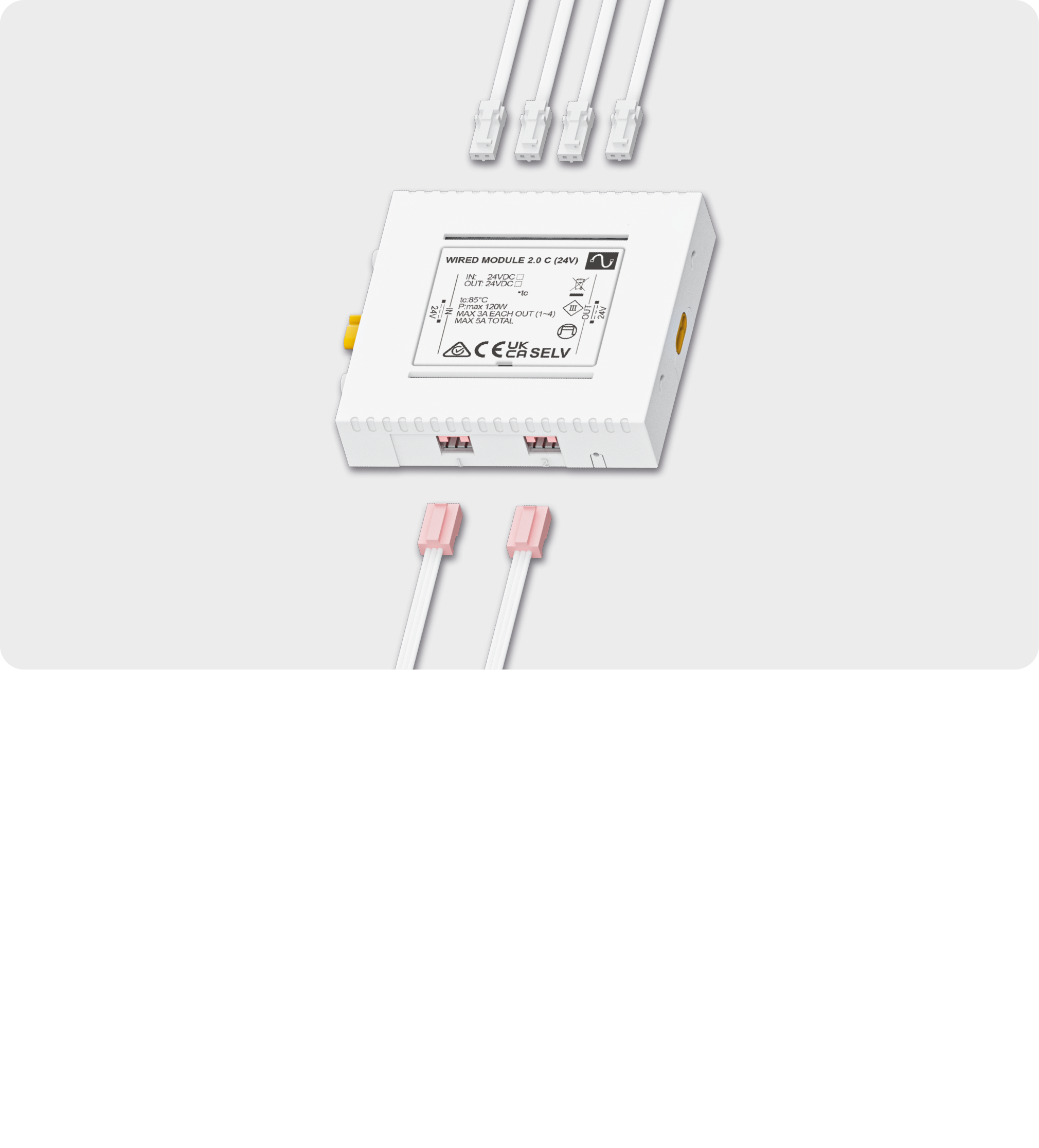 Up to 4 lamps (LED MONO) simultaneous control; compatible with cabled IR, PIR and TOUCH sensors, sold separately (max. 2 sensors per module - Sensors are supplied as standard with 700mm cable, 3000mm cable sold separately). Maintain the same operating voltage of 24V for all connected modules in a continuous line.