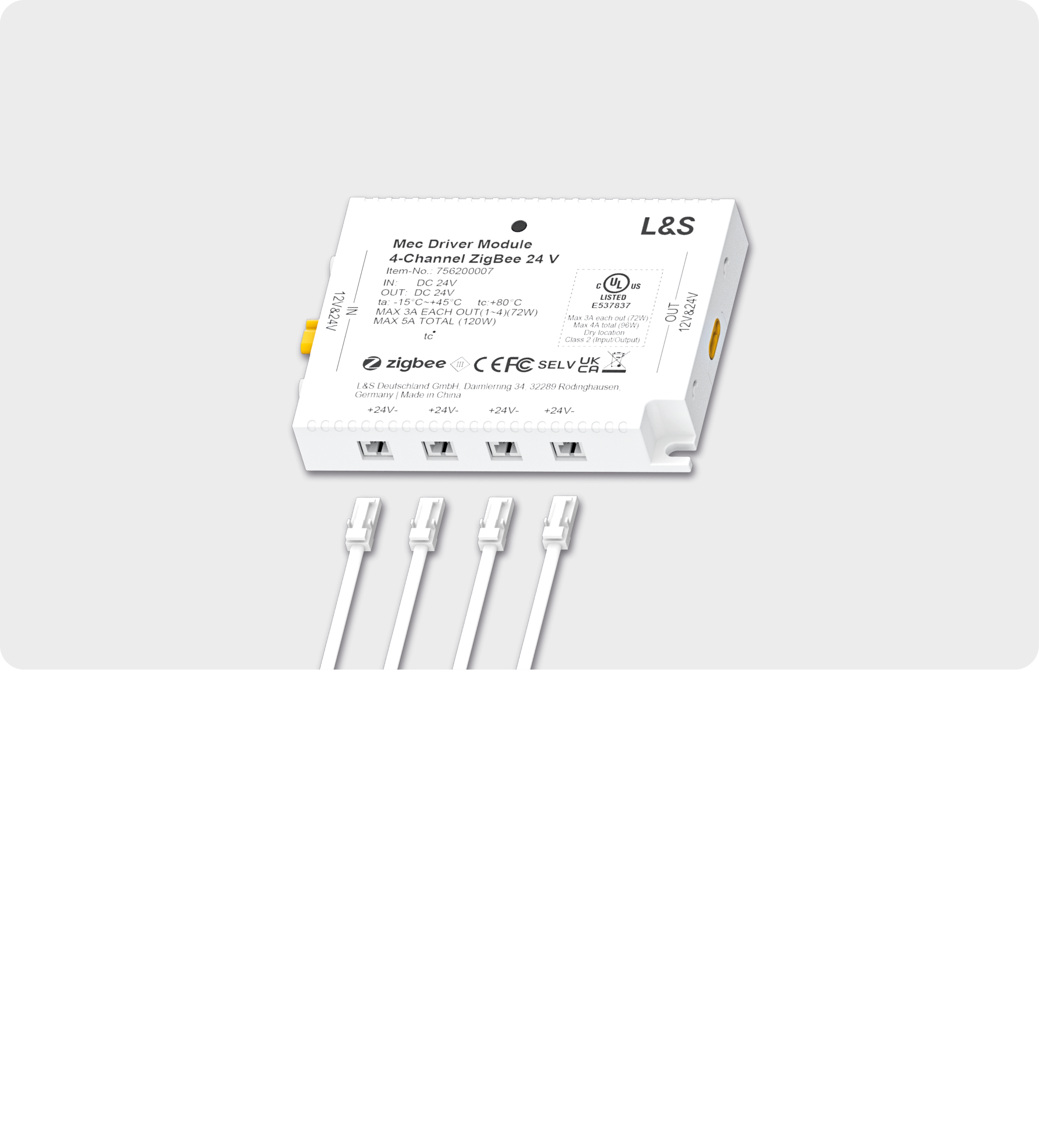 The module works with the ZigBee wireless protocol and can be connected with other Smart Home devices in a reliable low-energy consumption mesh network through a compatible Bridge (e.g., Philips Hue - not included). Maintain the same operating voltage of 24V for all connected modules in a continuous line.