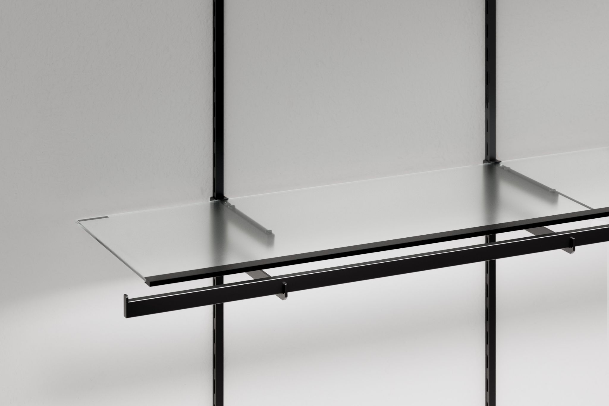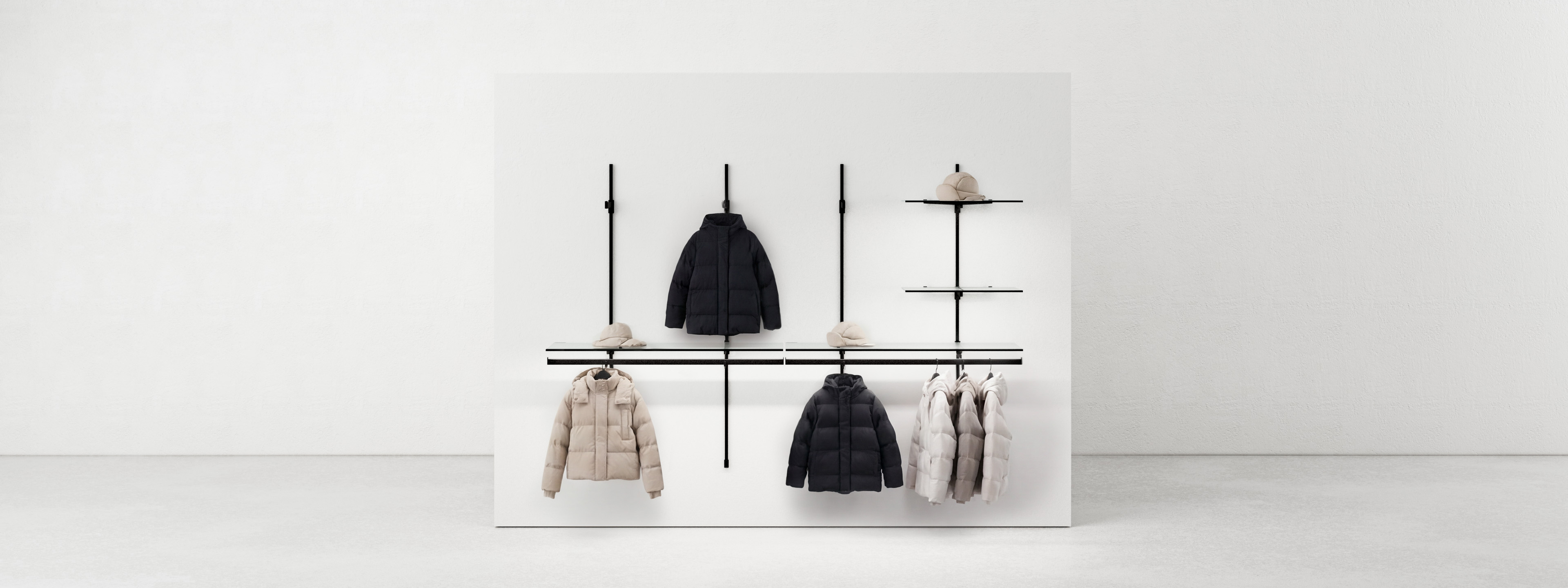 Beam EVO offers a high degree of planning freedom. The system is not bound to fixed axes and can be positioned independently of the profile grid. Merchandise supports are hooked into the profile from the front and can be adjusted in height without being removed. The absence of visible slots creates a calm and reduced visual language.