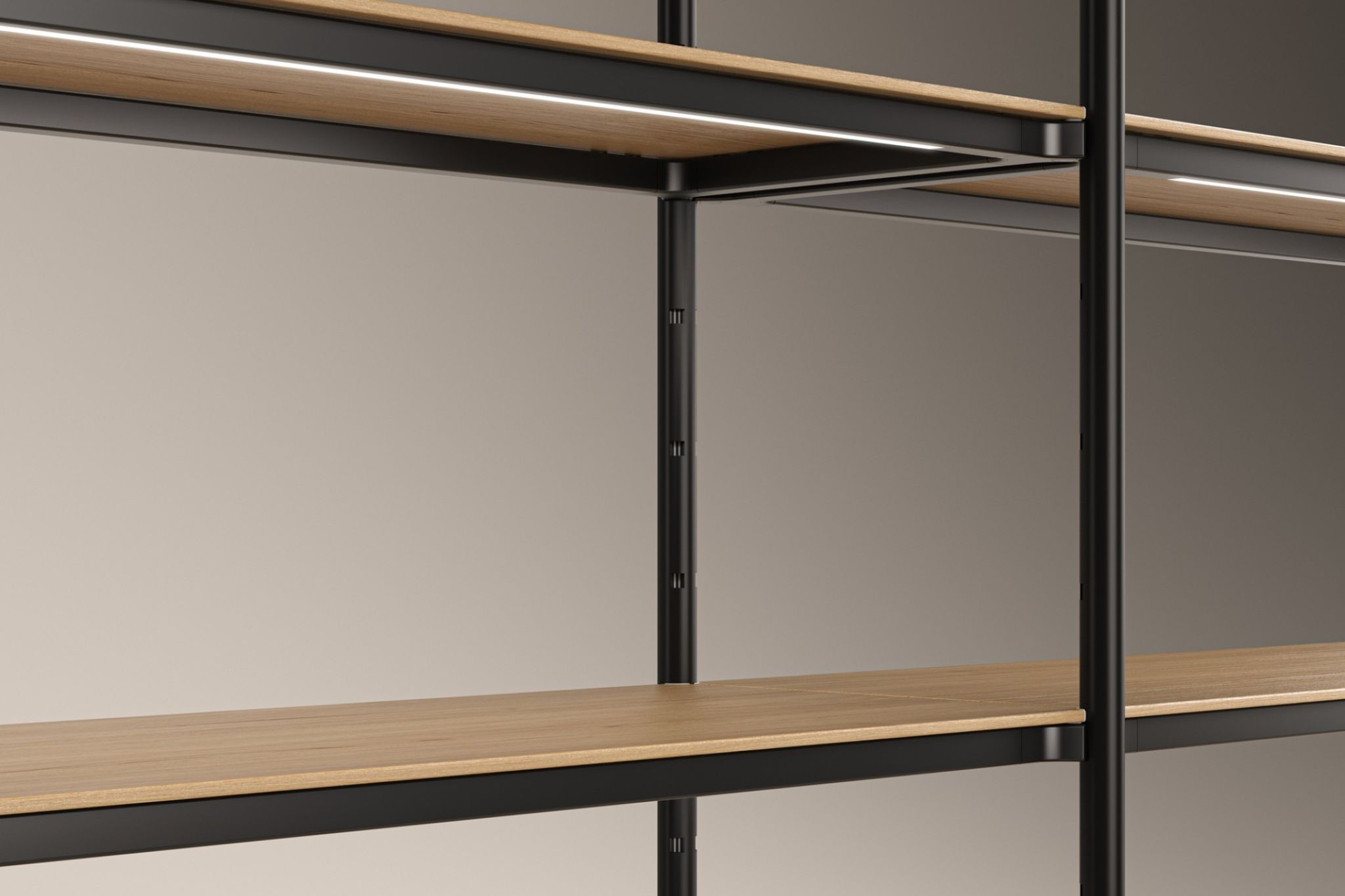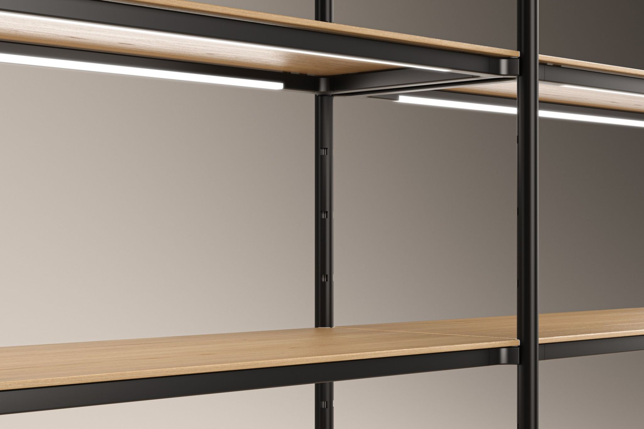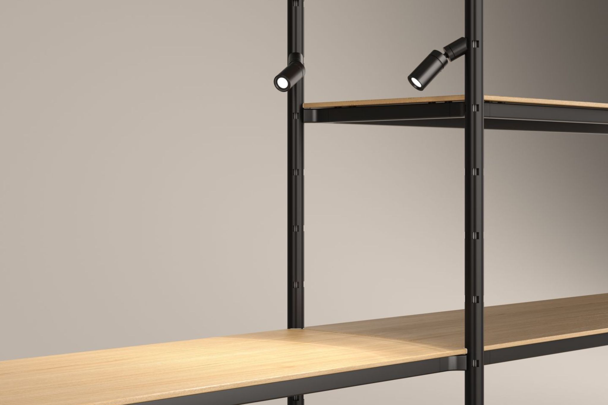 Thanks to integrated electrification, the cableless shelf frames are instantly powered when inserted into the uprights, facilitating the use of shelf lighting and digital devices for striking merchandise displays. LED spotlights can also be fitted into the uprights.