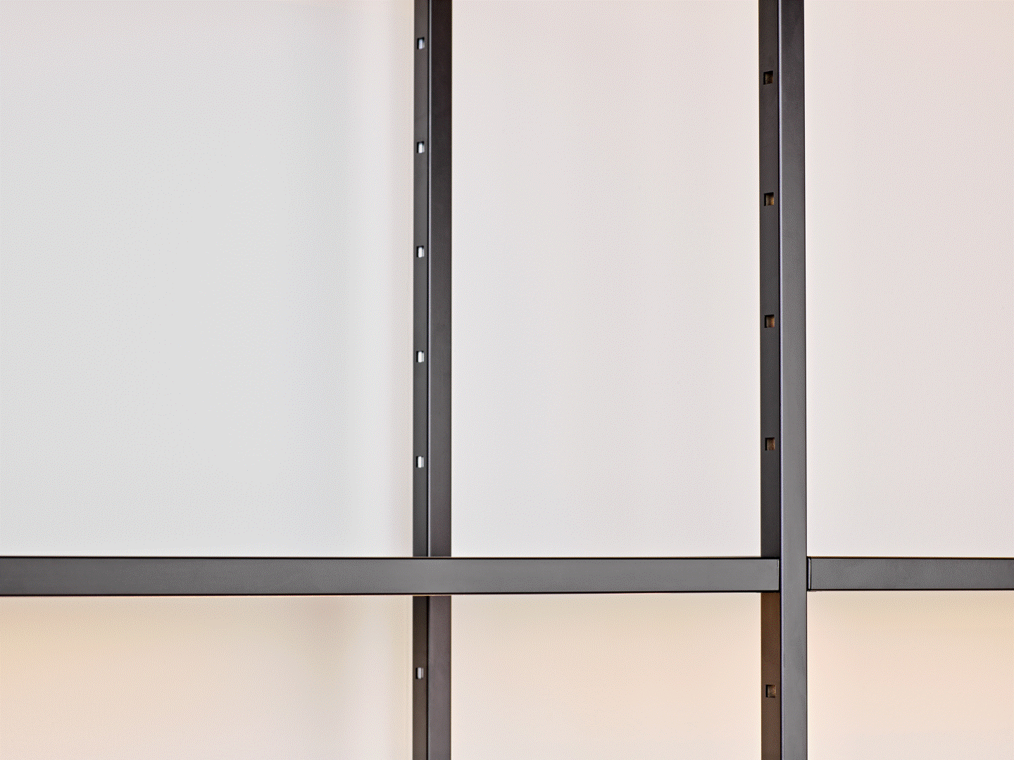Thanks to the built-in electrical rails, merchandise supports with LED lighting are instantly powered when inserted into the frame. Digital devices and other equipment such as electronic shelves can also be easily integrated.