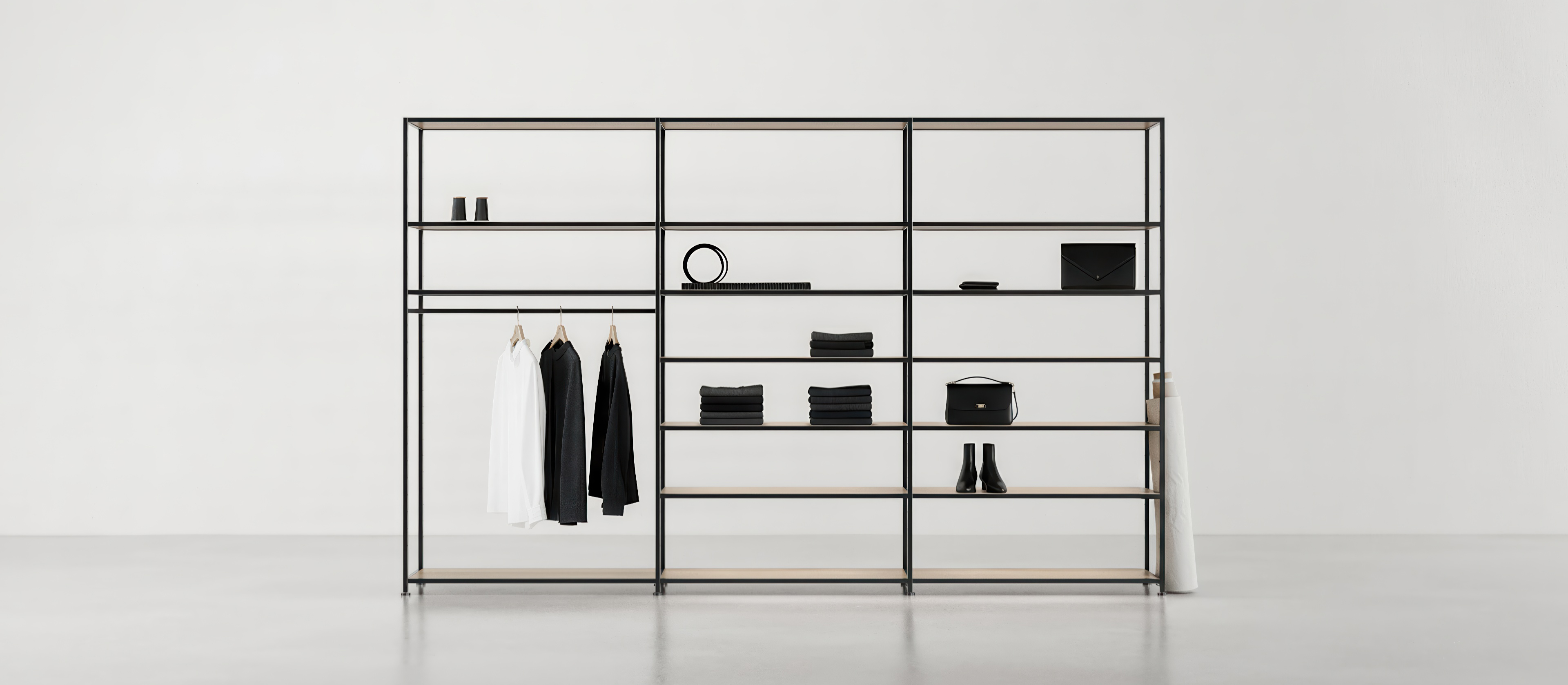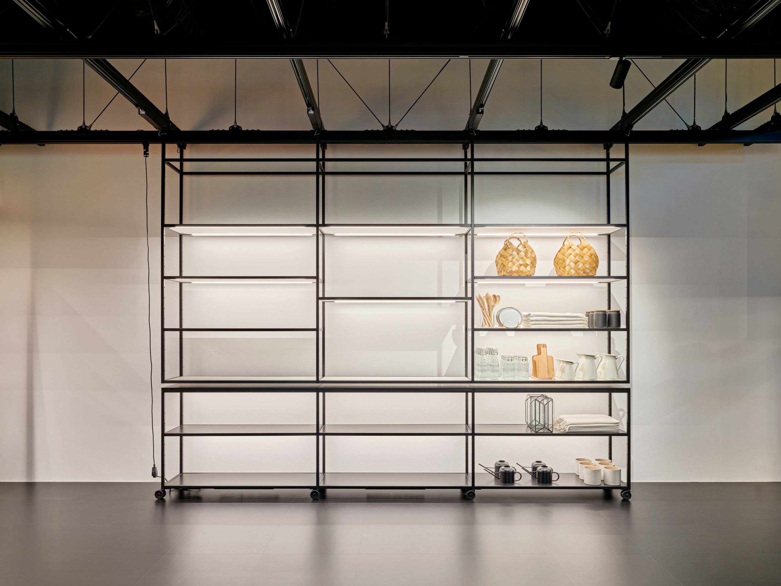 Qubo 25 puts the spotlight on the merchandise: thanks to its understated linear design, the versatile structural shelving system is a modern solution for immaculate displays – in the form of cubes, shelf units, tables, plinths or gondolas.