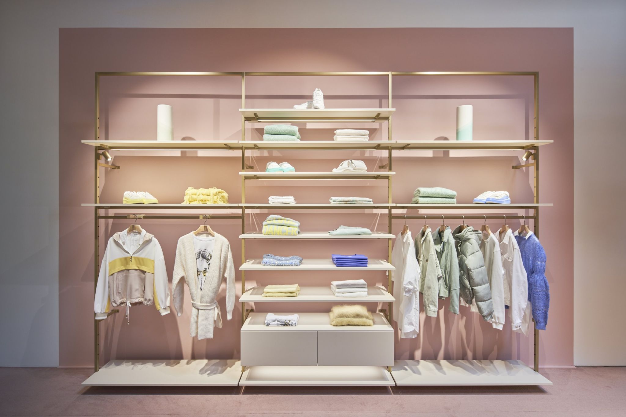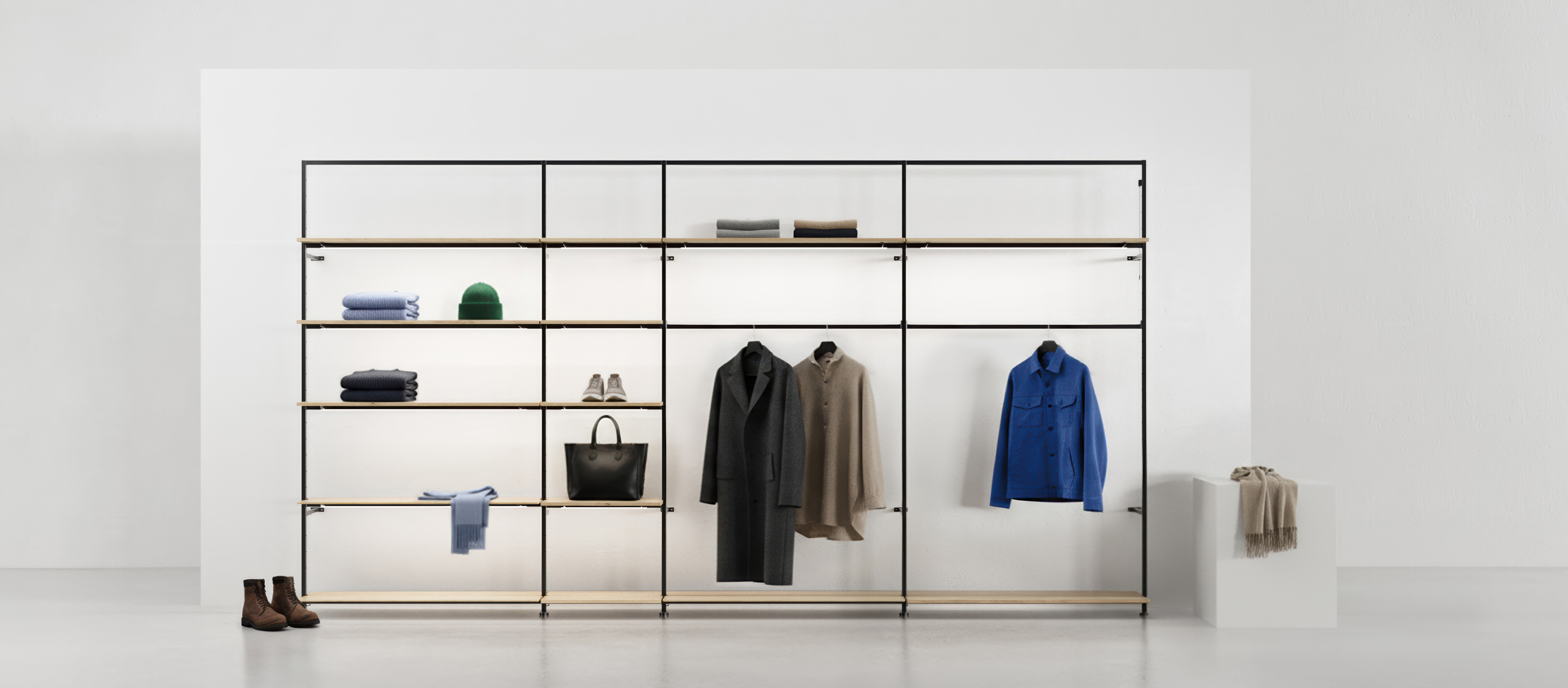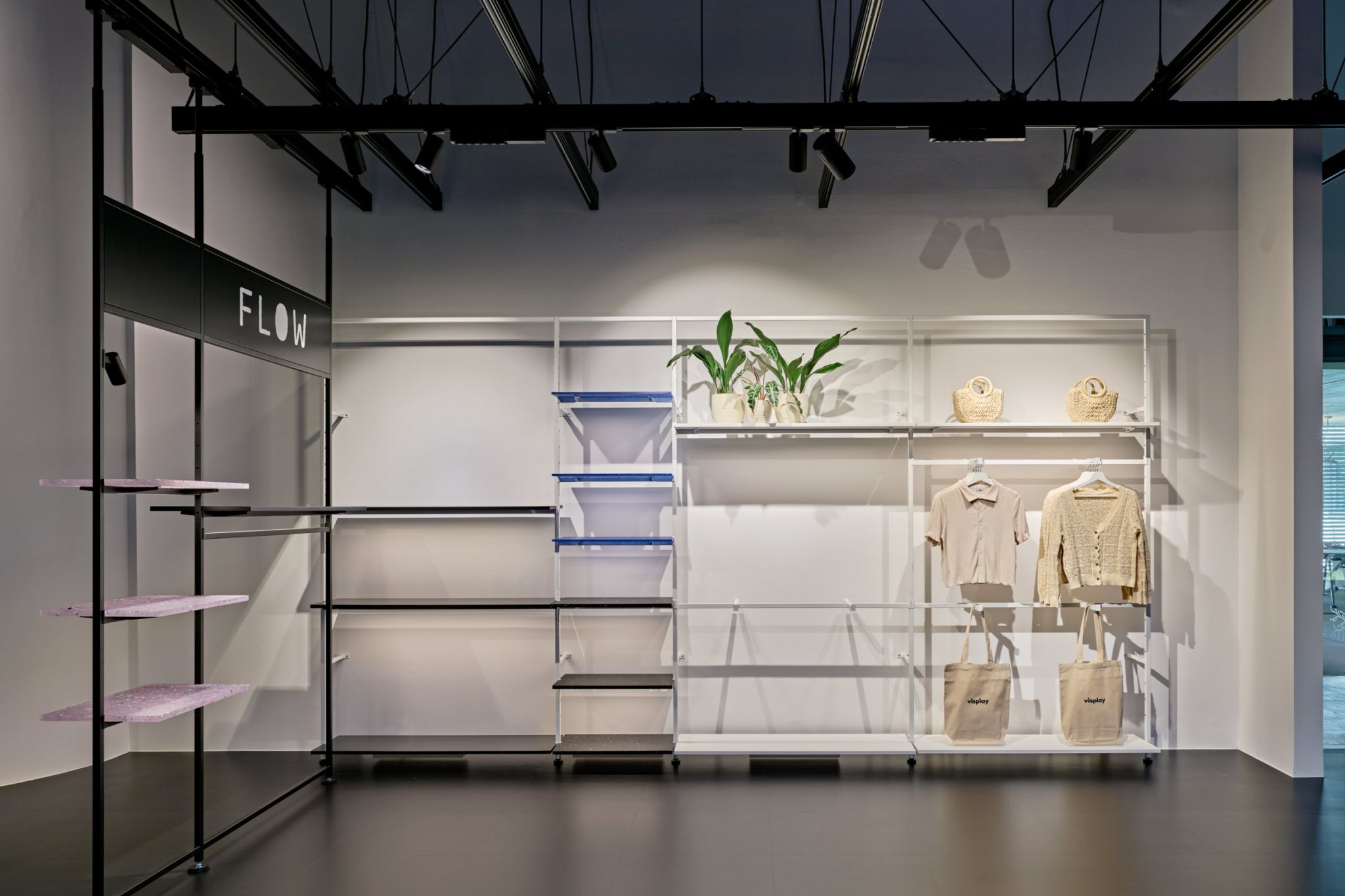 The structural shelving system Qubo Wall is mounted directly on the wall and its understated aesthetic puts the emphasis solely on the merchandise.