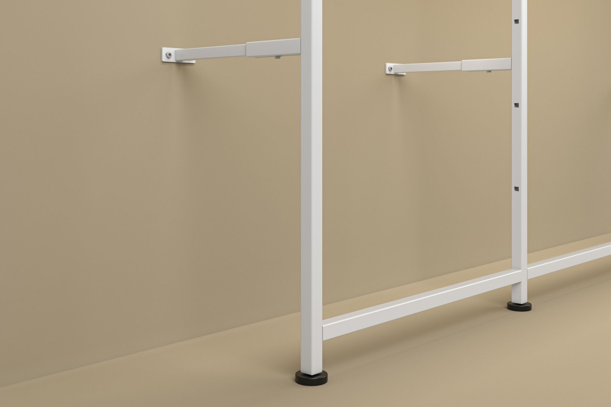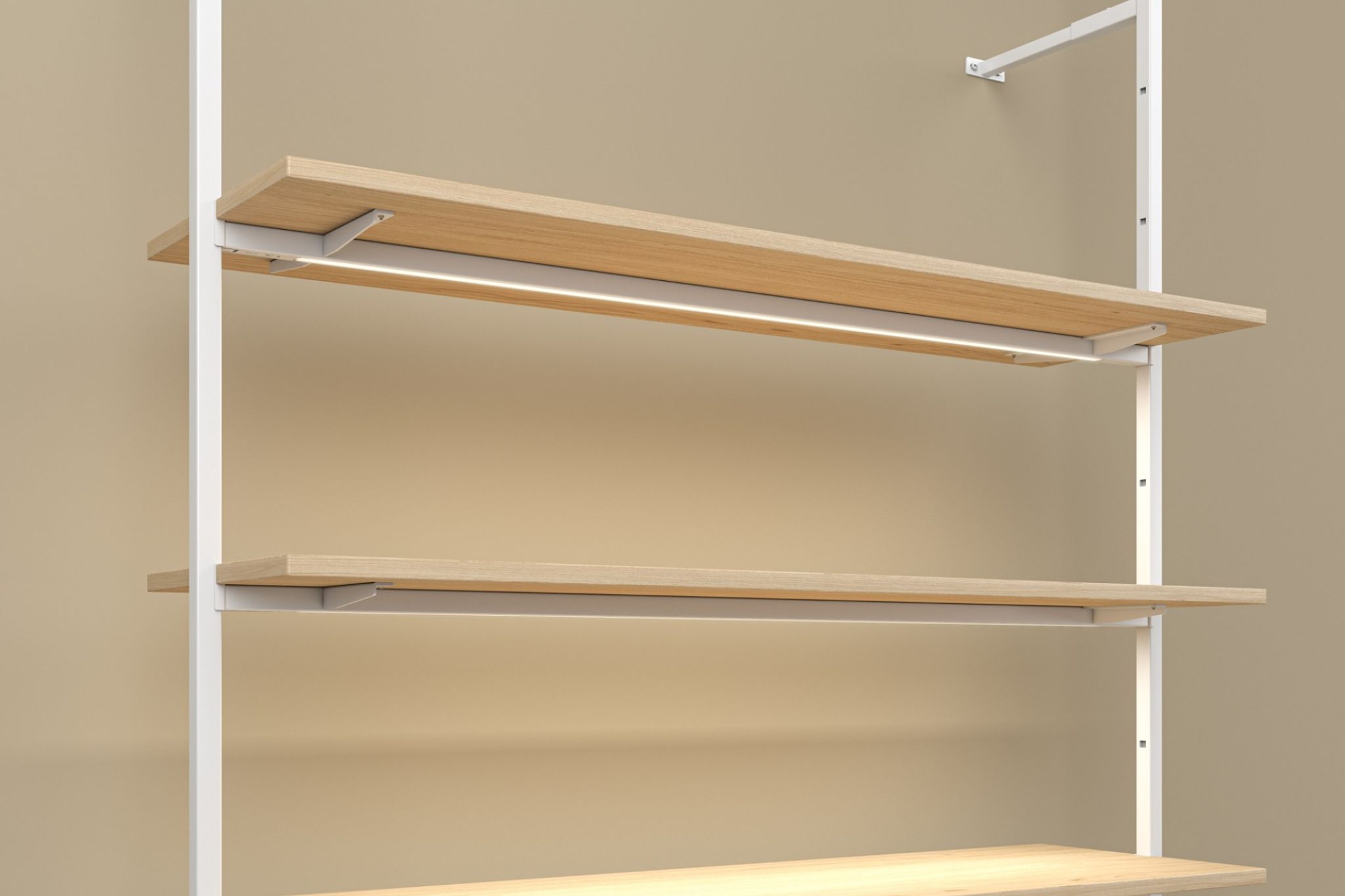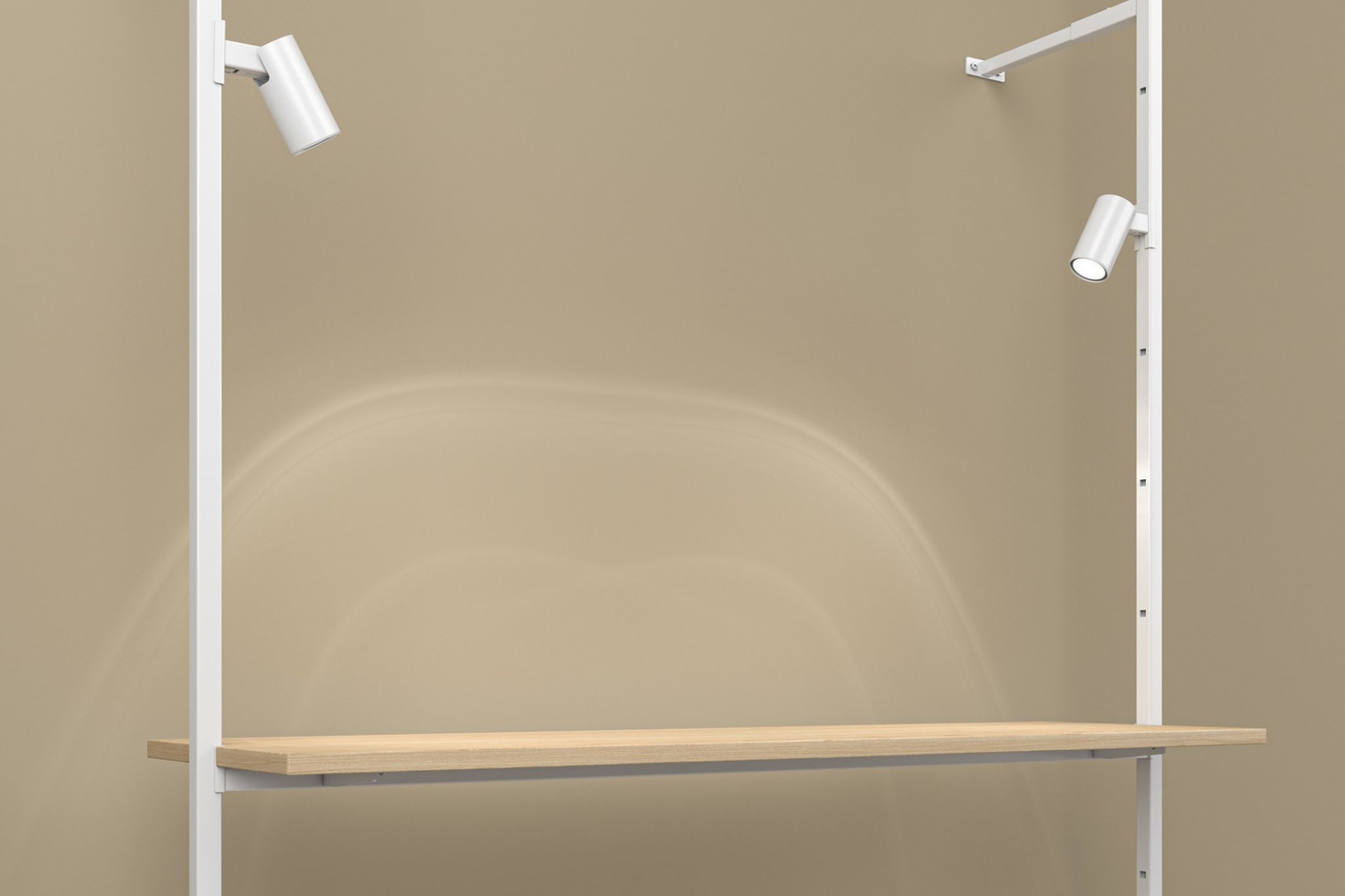 Electrification is integrated in the wall uprights, instantly powering LED lighting, digital devices and other appliances when the merchandise supports are inserted into the structure. LED spotlights can also be hooked into the uprights.