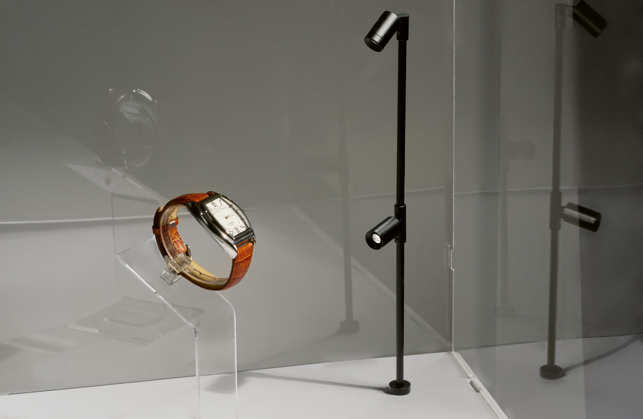 Compact spotlights for display cases and counters.