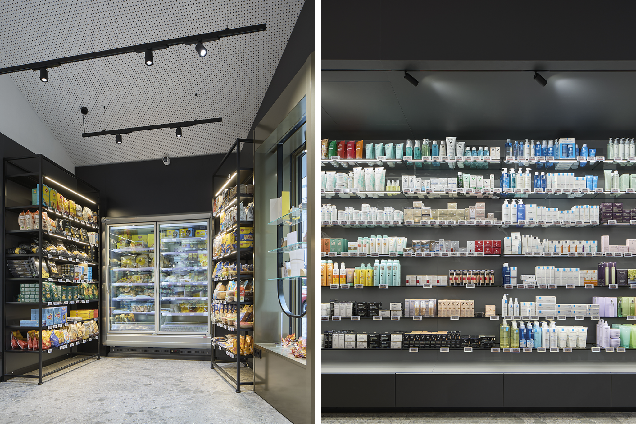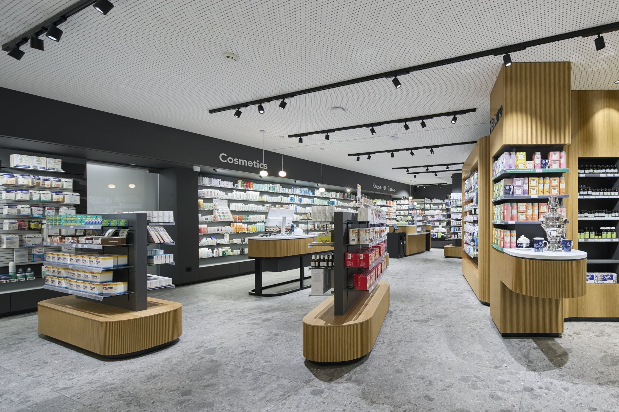 The pharmacy's extensive range requires a versatile product presentation. Thanks to the electrification, Invisible 6 offers the opportunity to effectively showcase the goods with the help of LED lighting and also enables the integration of digital devices. Area 13 and Invisible 3 are used for the presentation of smaller items. In the pharmacy food sector, Qubo 25 is particularly suitable for larger products thanks to its robust design and integrated lighting.