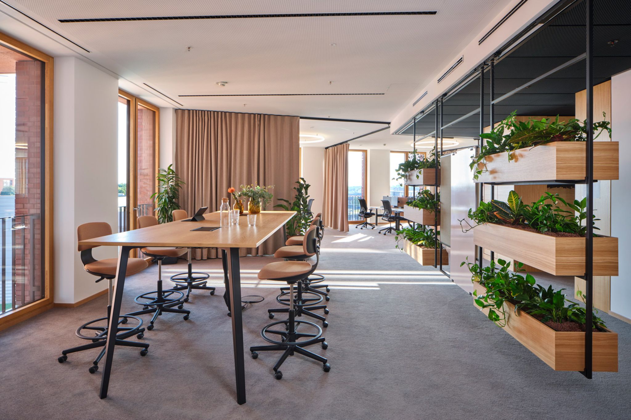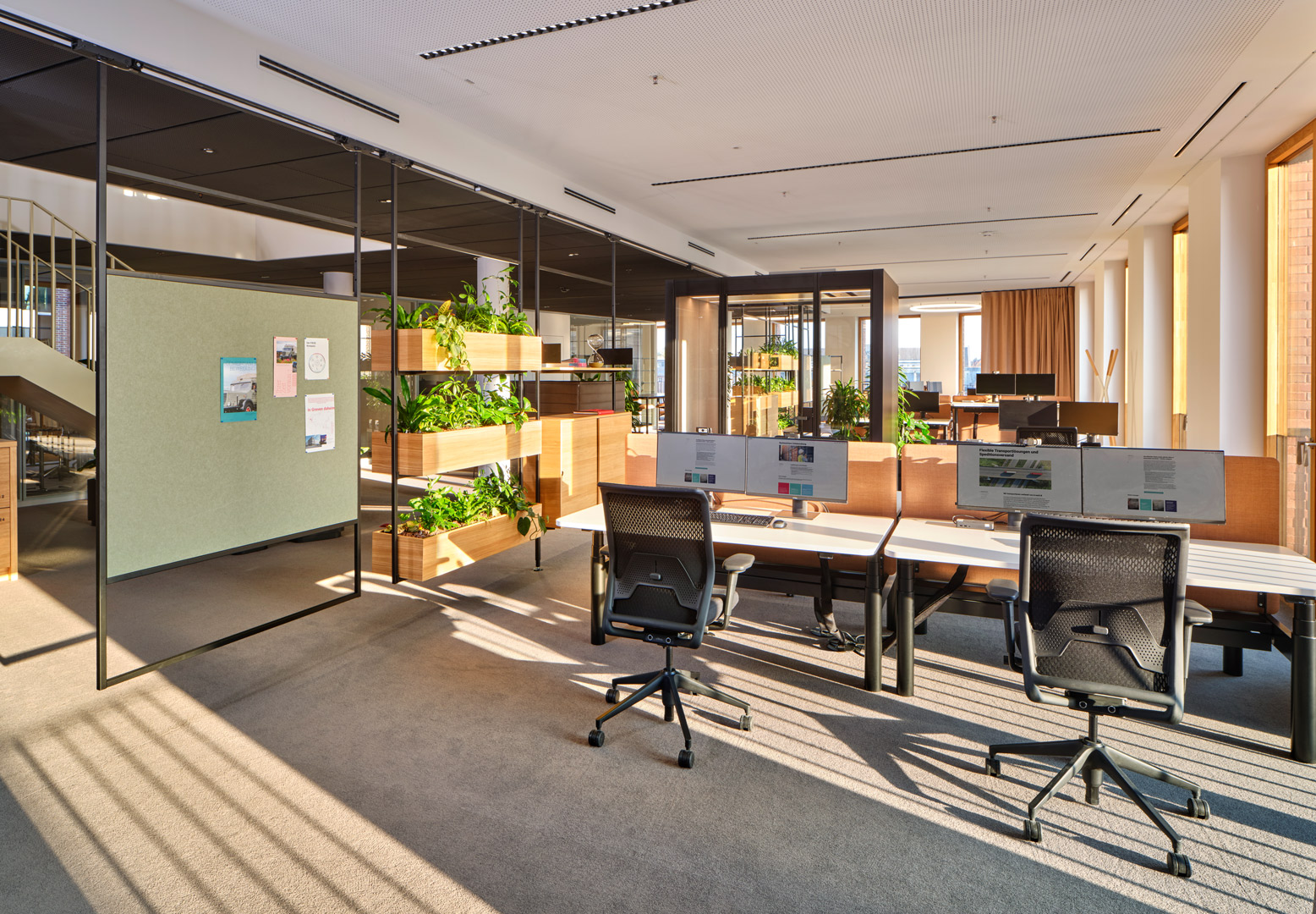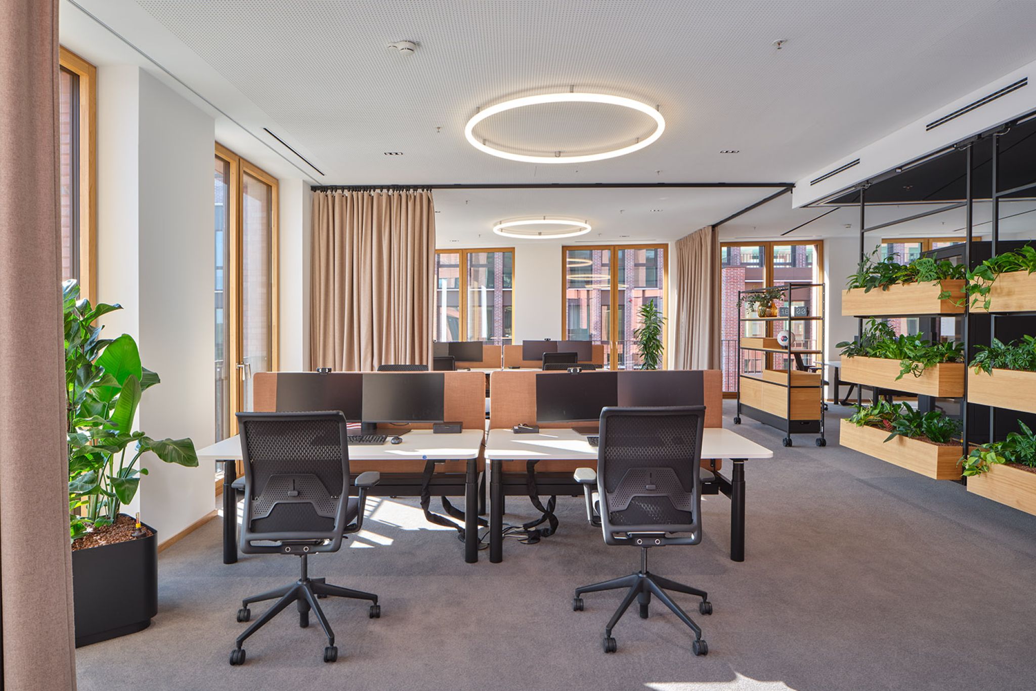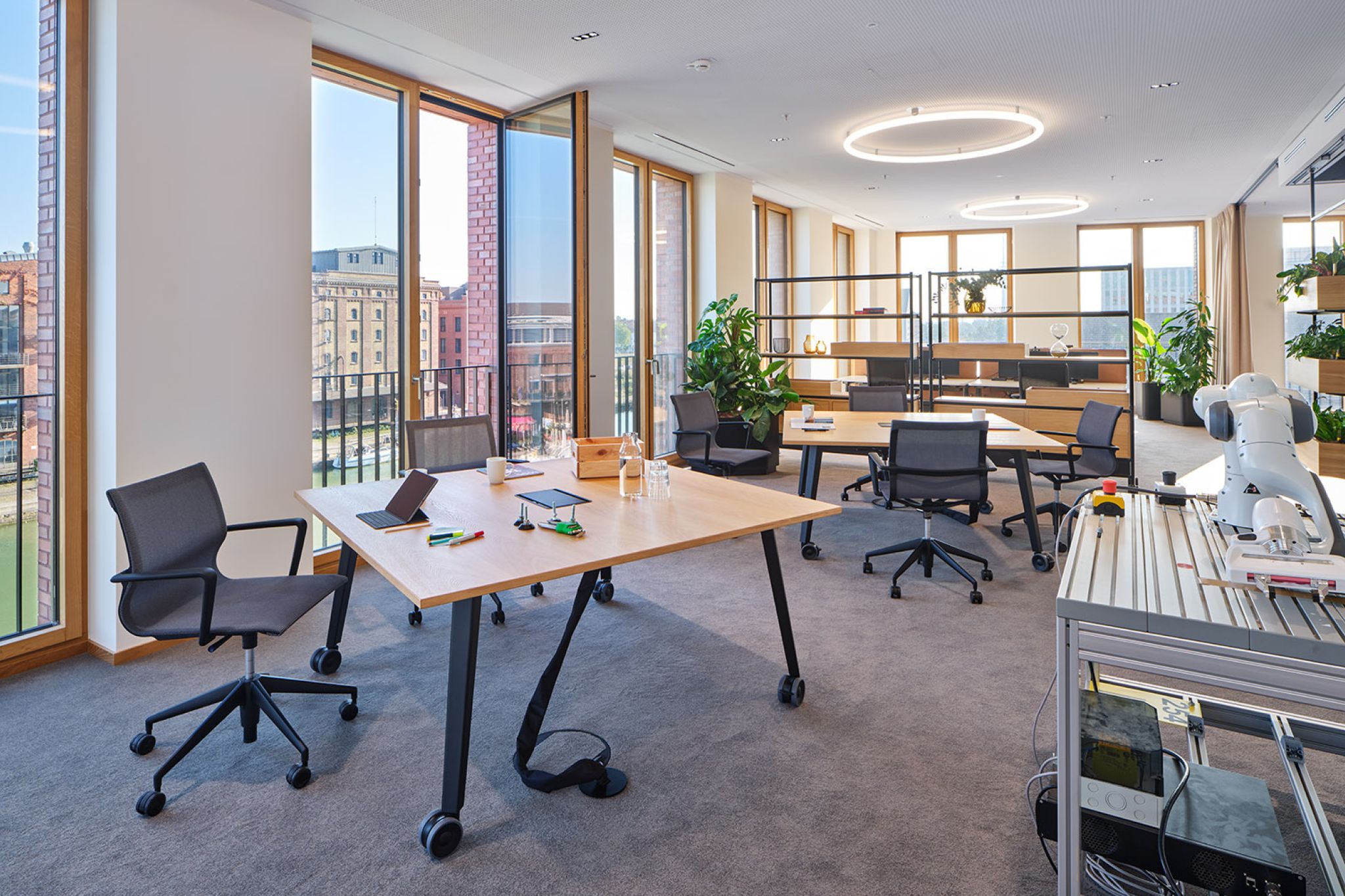 FIEGE, a family-run business recognized as a leader in logistics innovation, has introduced a cutting-edge New Work environment in its new office building at Münster’s Kreativkai harbor. The modern workspace was designed using our modular Omnio Office system and our versatile Multi-Lane ceiling rail system.