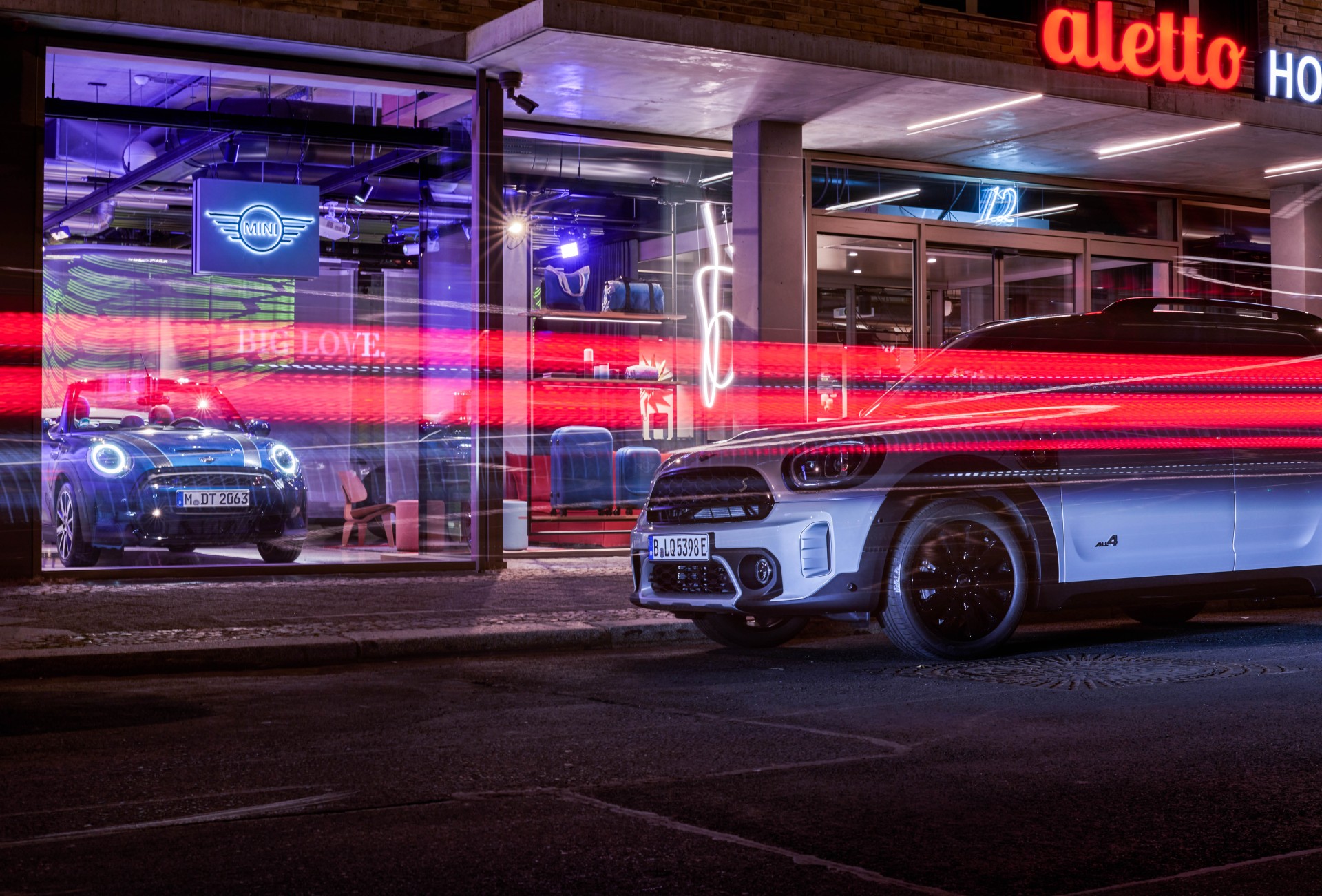 Red illuminated shop window of a building with cars of vehicle manufacturer MINI displayed inside.