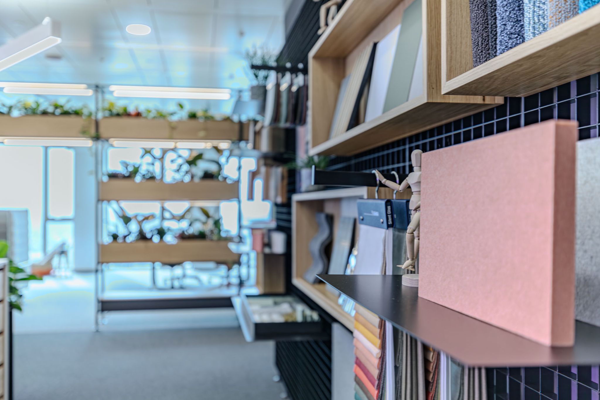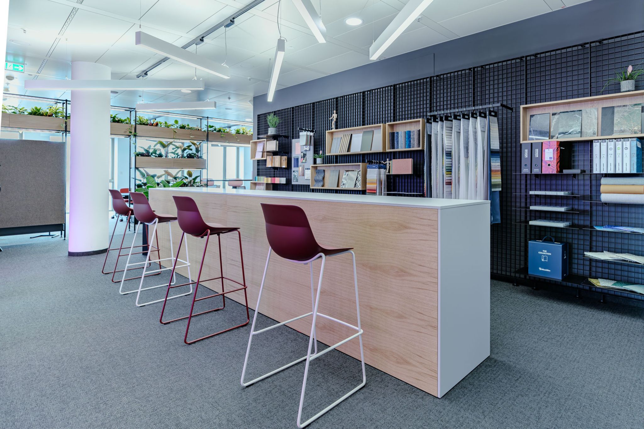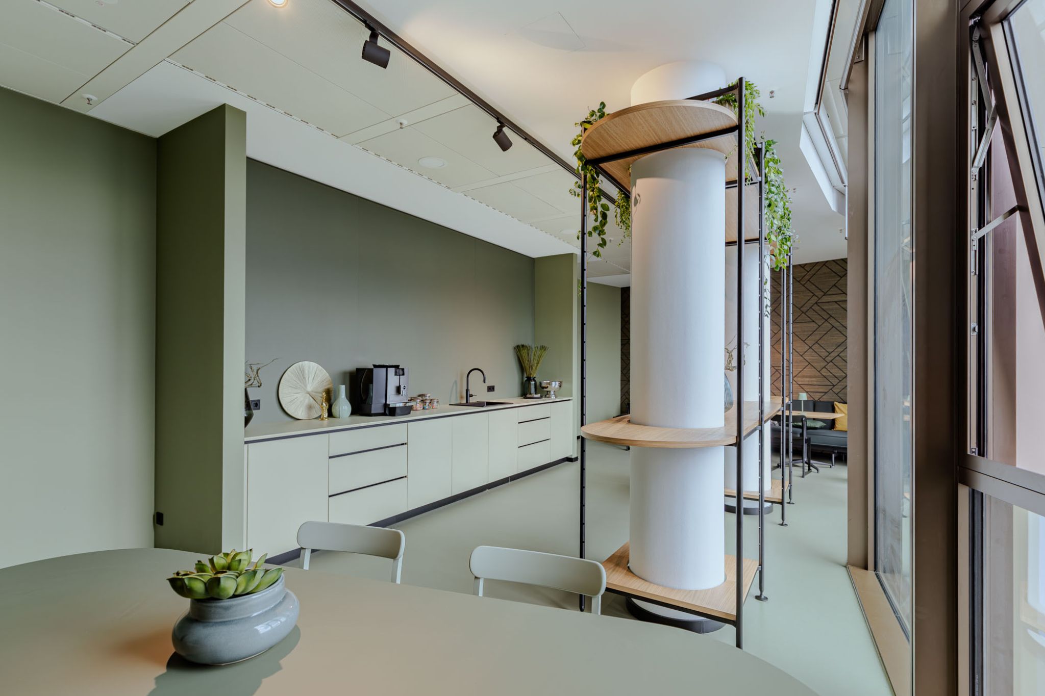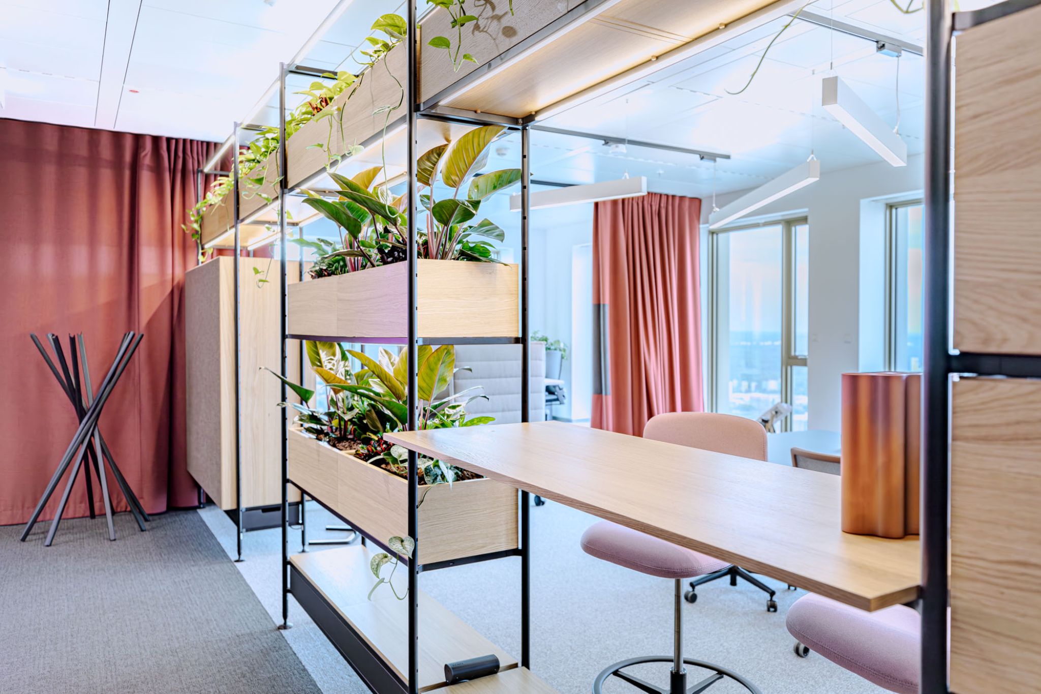 Omnio Office provides flexible space division with integrated storage across the expansive office area. Planters not only serve as visual barriers but also bring more vibrancy into the space. In addition to shelving, work surfaces can also be integrated into the system—ideal for work and interaction areas.