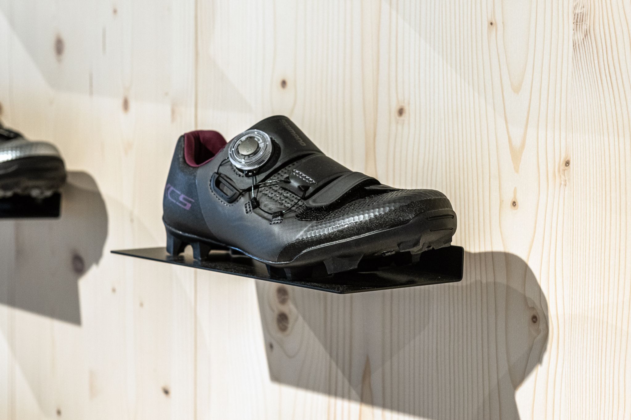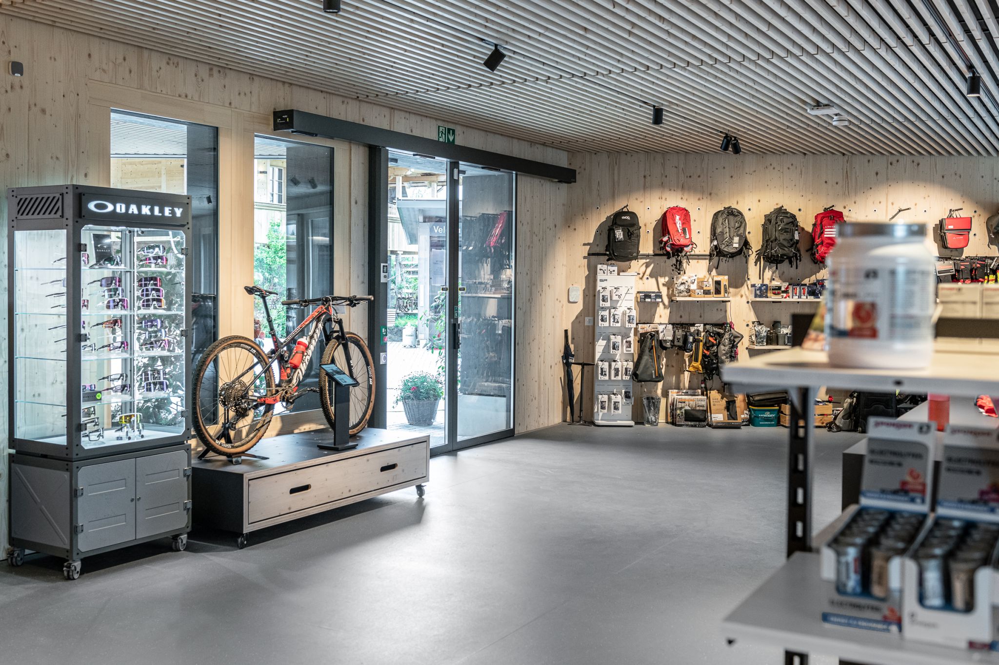 The new building impresses with a modern and light-flooded design. The clever integration of the black mono sleeves into the store's wooden panels ensures an attractive presentation of the merchandise. The thoughtfully incorporated merchandise supports effectively highlight the collection of bicycle accessories, resulting in an impressive display.