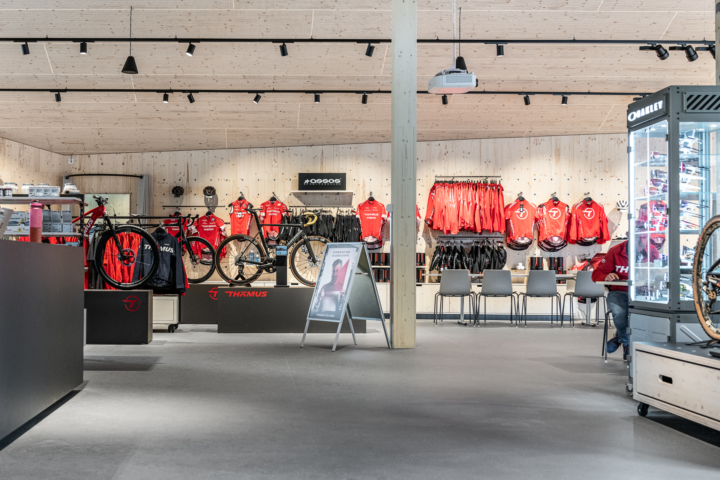 For more than three decades, Thömus, the Swiss bicycle manufacturer, has been setting standards within the bicycle industry and exemplifying exceptional Swiss bicycle high-tech. In their new headquarters located in Oberried, Switzerland, the integration of the store, bistro, offices, and workshop has been orchestrated within a contemporary framework. To materialize this vision within the store, we employed our Mono 20 single-point support system.