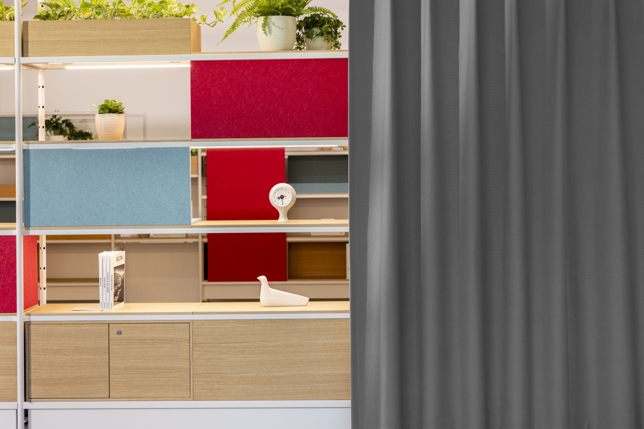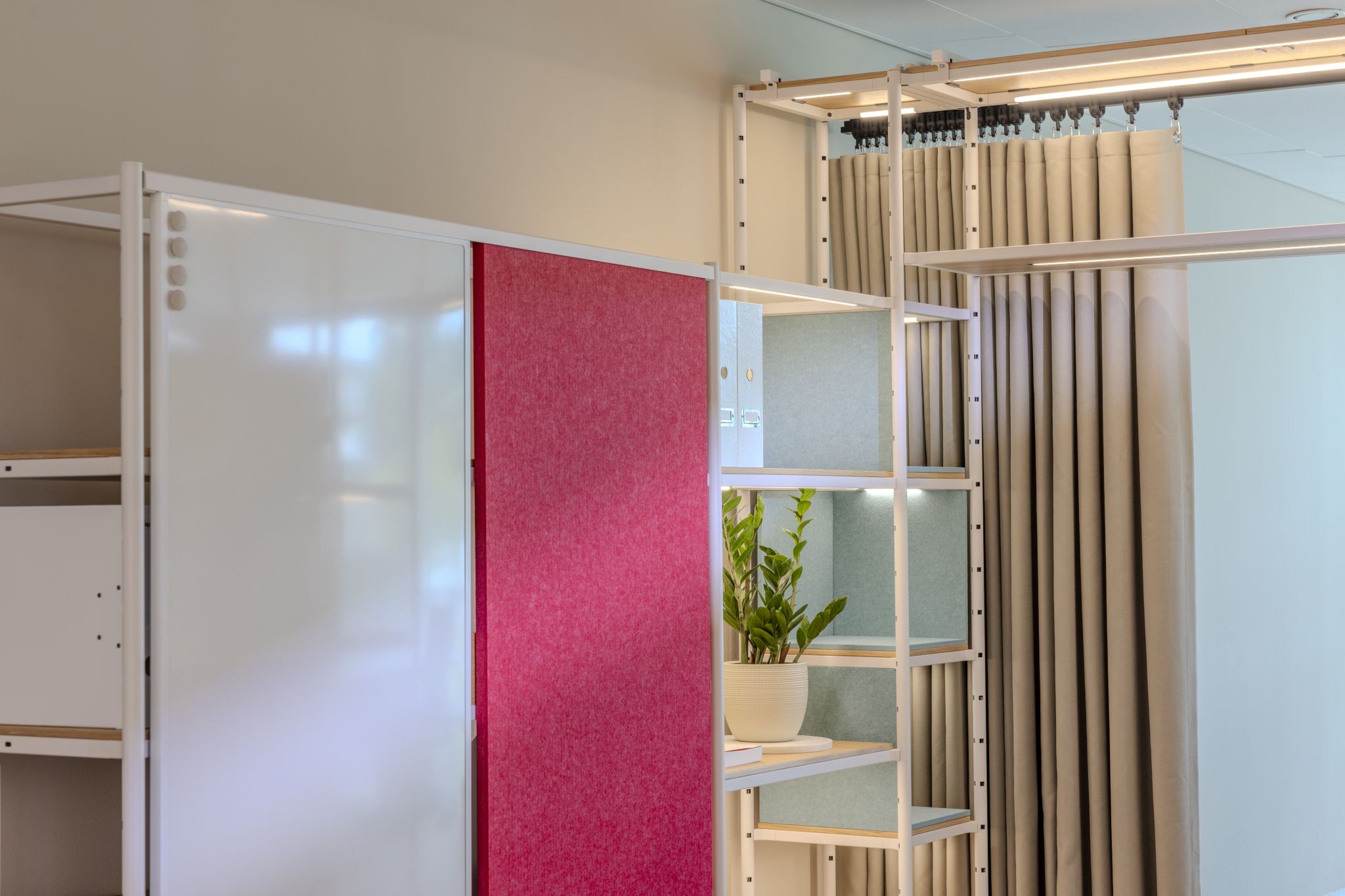 In the Visplay Office, the acoustic boards from Impact Acoustic not only serve as room dividers and acoustic shields, but also add attractive design accents. These functions are further complemented by the integrated curtain.
